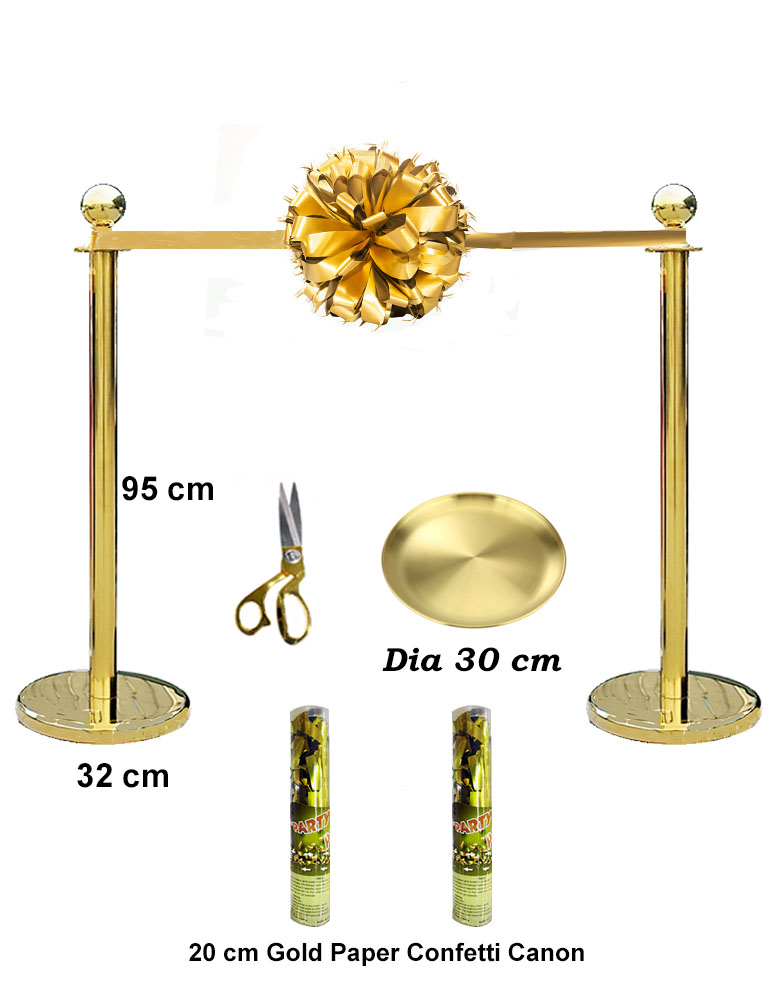 One Gold Tray, One Gold Color Ribbon, One pair of gold plated free stand stanchions, two gold paper confetti poppers, and One Gold Scissor for the official Opening Ceremony and Product Launching.